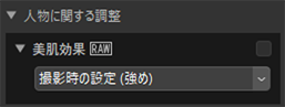 肌の補正度合いを調整します。カメラのメニューで美肌効果を[しない]以外に設定して撮影したRAW 画像またはピクセルシフト合成画像のみ調整可能です。