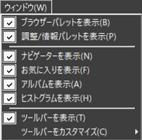 ブラウザーパレットを表示]/[調整/情報パレットを表示]/[ナビゲーターを表示]/[お気に入りを表示]/[アルバムを表示]/[ヒストグラムを表示