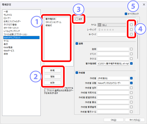 - XMP/IPTCプリセットの新規作成および選択したXMP/IPTCプリセットの複製/削除が行えます。