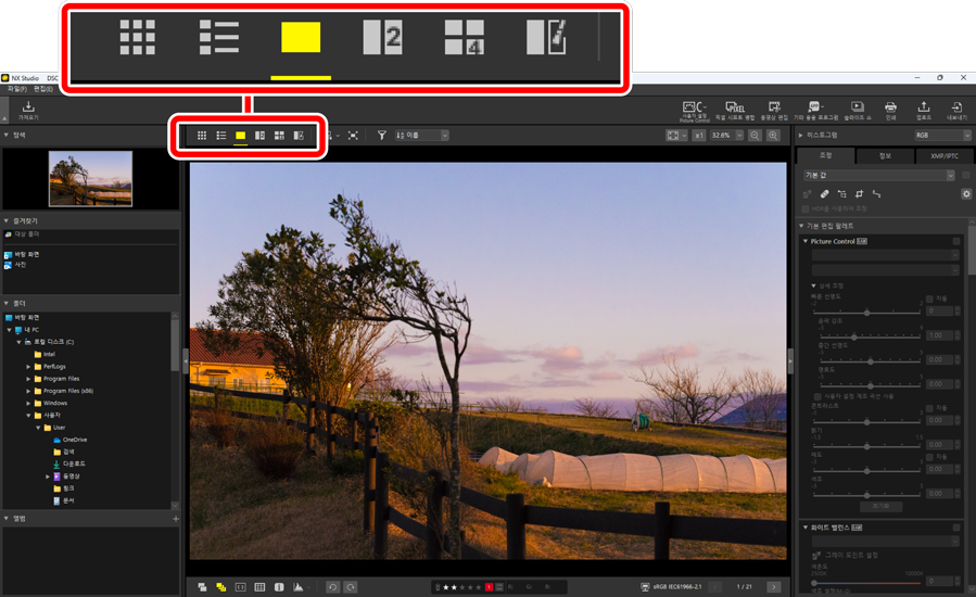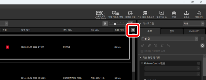 보기 영역의 오른쪽 위에 있는 버튼을 사용하여 이미지 뷰어, “2/4 화상” 및 전후 화면에서 화상의 디스플레이 크기를 선택합니다.