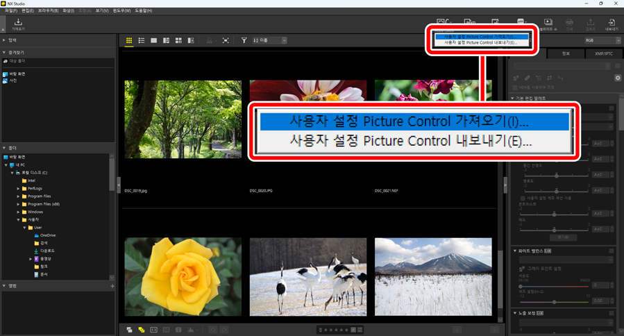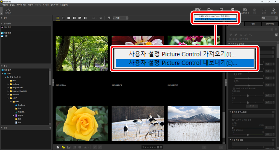 NX Studio에 저장된 사용자 설정 Picture Control을 파일로 내보낼 수 있습니다.