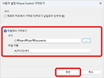 [사용자 설정 Picture Control 가져오기] 대화 상자에서 [파일에서 가져오기]를 선택하고 가져올 파일을 선택한 다음 [확인]을 클릭합니다.