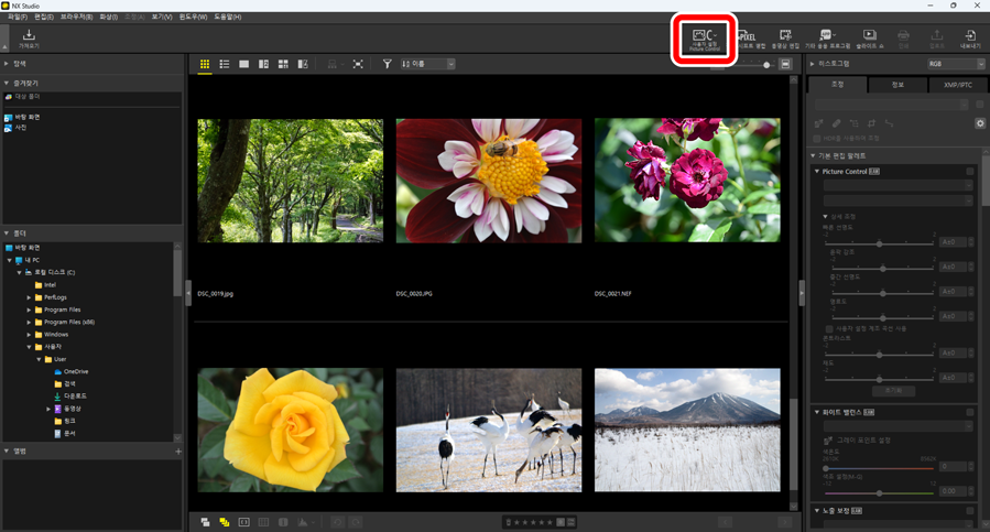 도구 모음에서 [사용자 설정 Picture Control] 버튼을 클릭하면 카메라 또는 소프트웨어에서 사용자 설정 Picture Control 파일을 가져와서 NX Studio에 저장할 수 있을 뿐만 아니라 NX Studio의 조정 팔레트에 있는 [Picture Control]을 사용하여 저장된 사용자 설정 Picture Control을 파일로 내보낼 수 있습니다.