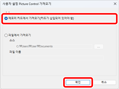 [사용자 설정 Picture Control 가져오기] 대화 상자에서 [메모리 카드에서 가져오기(카드가 삽입되어 있어야 함)]를 선택하고 [확인]을 클릭합니다.