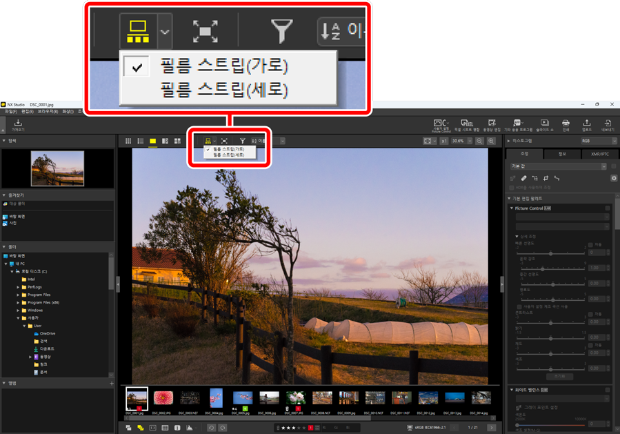 을 클릭하여 필름 스트립의 방향을 변경할 수 있습니다. 방향은 필름 스트립 도구의 아이콘에 반영되며, 필름 스트립이 뷰어 아래에 표시되면