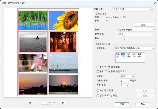 - [열 및 행]: 페이지당 인쇄되는 [열] 및 [행] 수를 선택합니다. 선택된 옵션에 따라 화상의 사이즈를 자동으로 조정합니다.