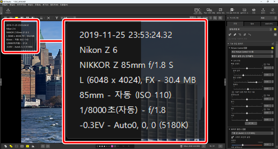 ) 뷰어에 카메라 이름, 촬영 날짜 및 기타 이미지 정보를 표시합니다.