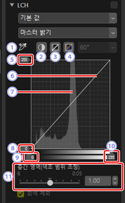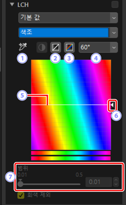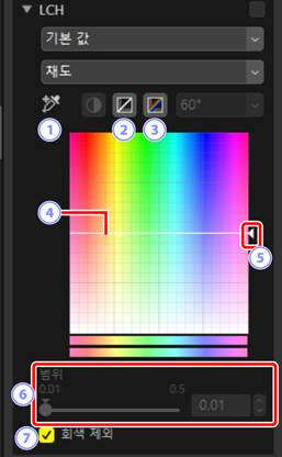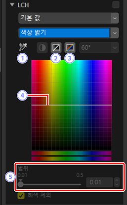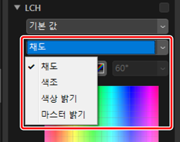 밝기, 채도 및 색조 채널을 조정합니다. LCH 도구의 메뉴를 사용하여 채널을 선택합니다. 사용 가능한 옵션은 선택한 채널에 따라 다릅니다. LCH 도구는 [HDR을 사용하여 조정]이 활성화되면 표시되지 않습니다.