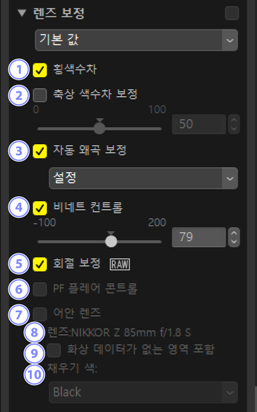 이 옵션을 선택하여 사진에 기록된 렌즈 정보를 사용하여 광각 렌즈와 관련된 왜곡과 망원 렌즈와 관련된 핀쿠션 왜곡을 줄입니다.