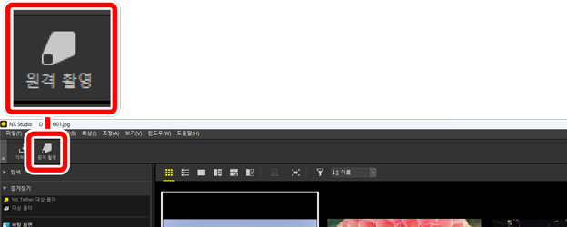 설치된 경우 도구 모음에서 [원격 촬영]을 클릭하여 NX Tether를 실행할 수 있습니다.