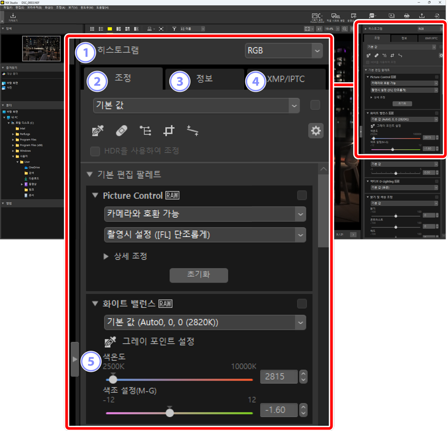 - 정보 표시 및 선택한 화상에 대한 조정을 표시합니다.