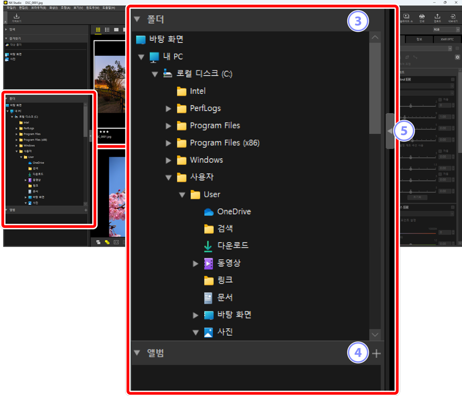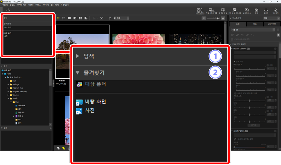 - 컴퓨터의 파일이 계층 형태로 표시됩니다. 폴더를 클릭하여 보기 영역에 포함된 화상을 표시합니다.