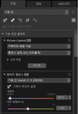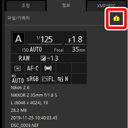 라벨 및 등급을 포함하여 XMP/IPTC 메타데이터를 편집합니다. 보기 영역 또는 [화상] 메뉴의 라벨 및 등급의 변경 사항은 [XMP/IPTC] 탭에 반영됩니다.