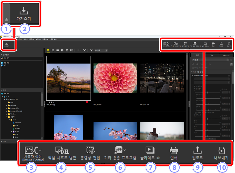 - [변경 사항이 없는 원본 화상 파일을 엽니다(조정 내용은 적용되지 않습니다).]: 파일은 원본 형식으로 열립니다. NX Studio의 변경 사항이 적용되지 않습니다.