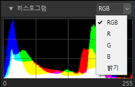 - [RGB]를 선택하여 [R](빨간색), [G](녹색) 및 [B](파란색) 세 채널을 서로 겹쳐서 히스토그램을 표시합니다. 히스토그램 중첩이 다른 색상으로 표시되는 영역입니다. [G] 및 [B] 중첩은 바다색으로, [R] 및 [B] 중첩은 밝은 자홍색으로, [R] 및 [G] 중첩은 노랑색으로 표시됩니다. 모든 채널이 중첩되는 영역은 흰색으로 표시됩니다.