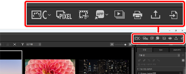 - 다른 소프트웨어를 사용하여 선택한 화상을 엽니다. 옵션 대화 상장의 [연결 프로그램]을 통해 소프트웨어를 추가할 수 있습니다(0 환경설정 대화 상자, [연결 프로그램]).