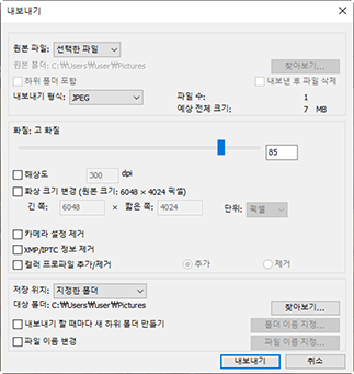 사진을 조정한 후 다른 이름으로 JPEG, HEIF 또는 TIFF 파일로 저장할 수 있습니다. 이후 다른 소프트웨어에서 화상을 사용할 수 있습니다.