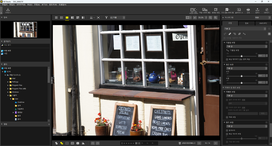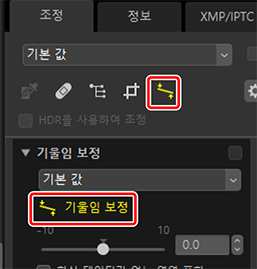 )을 끌어서 화상의 기울임을 보정합니다. 기울임 보정