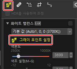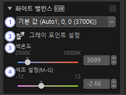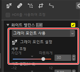 화이트 밸런스 메뉴에 [그레이 포인트 사용]이 나타나면 [색온도]가 [세부 조정]으로 변경되고 슬라이더를 사용하여 화이트 밸런스를 세부적으로 조정할 수 있습니다.
