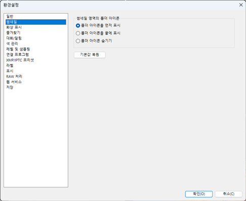 - [폴더 아이콘을 먼저 표시]: 화상 앞에 하위 폴더가 먼저 나열됩니다.