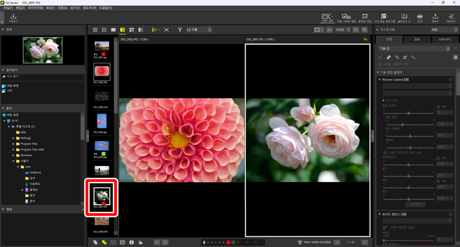 을 선택하여 선택한 화상과 보정 이전 화상을 비교합니다. 현재 화상의 모든 변경 사항은 오른쪽 창에 반영됩니다(0 조정 탭).