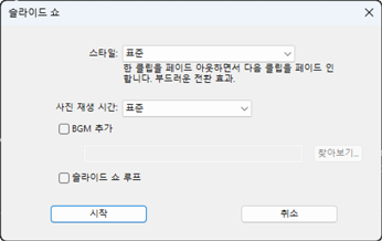 [슬라이드 쇼] 대화 상자의 옵션은 사진 표시 시간, 슬라이드 간 전환 및 기타 슬라이드 쇼 설정을 제어합니다. 설정을 조정한 후 [승인]을 클릭하여 쇼를 시작합니다.
