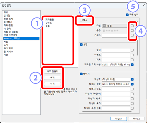 - XMP/IPTC 미리 설정에서 모든 항목을 선택하거나 선택 취소합니다.
