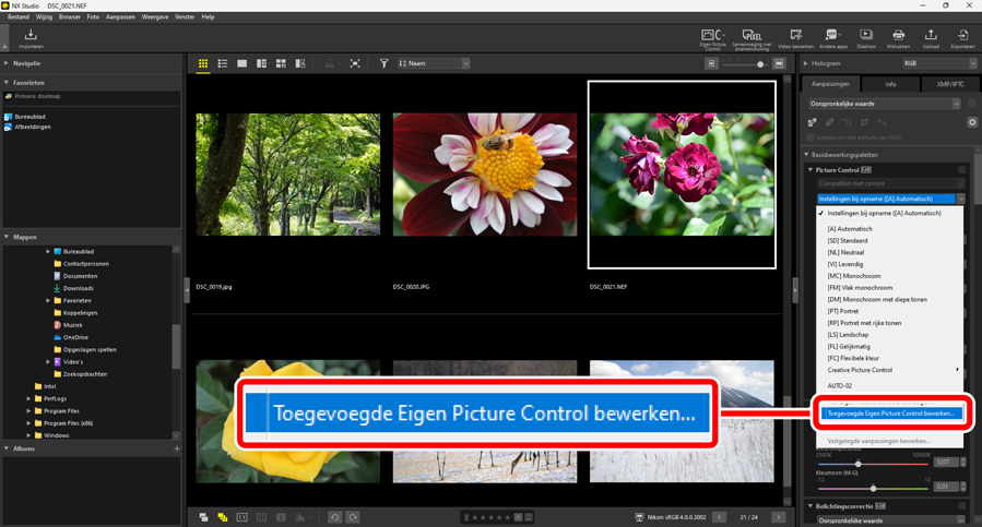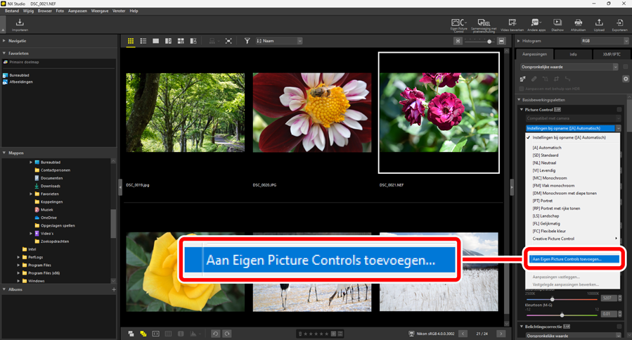 Er kunnen maximaal 150 Eigen Picture Controls worden toegevoegd aan NX Studio.