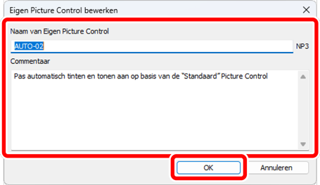 Geef in het dialoogvenster [Eigen Picture Control bewerken] de Eigen Picture Control een naam en voeg commentaar toe. Klik vervolgens op [OK].