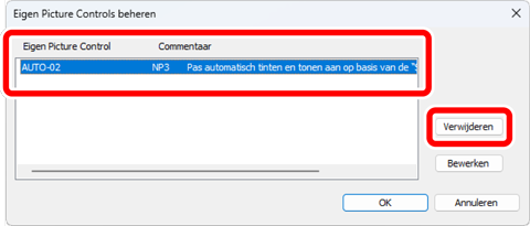 Selecteer in het dialoogvenster [Eigen Picture Controls beheren] een Eigen Picture Control en klik op [Verwijderen].