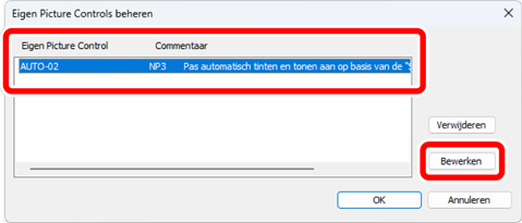 Selecteer in het dialoogvenster [Eigen Picture Controls beheren] een Eigen Picture Control en klik op [Bewerken].