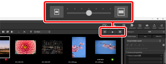 Gebruik de knoppen in de rechterbovenhoek van het weergavegebied om het weergaveformaat te kiezen voor foto's in de image-viewer, “2/4 beelden” en voor-en-na-weergaven.