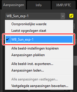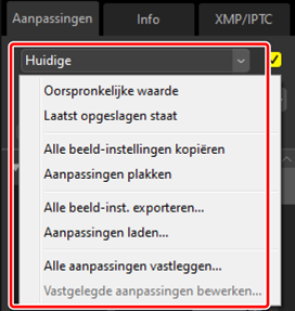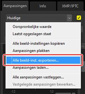Gebruik [Alle beeld-inst. exporteren] om alle aanpassingen op te slaan in een aanpassingsbestand. Het bestand kan vervolgens worden geladen en toegepast op de foto's in de huidige selectie met behulp van [Aanpassingen laden]. Aanpassingsbestanden kunnen ook worden gekopieerd voor gebruik op andere computers.