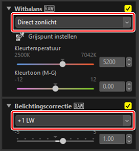 Pas instellingen aan in het aanpassingenpalet. Hier hebben we [Witbalans] ingesteld op [Direct zonlicht] en [Belichtingscorrectie] op [+1 LW].