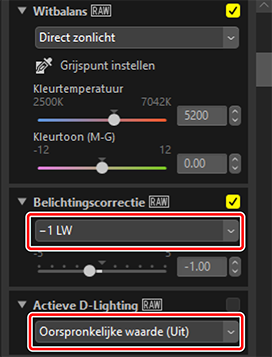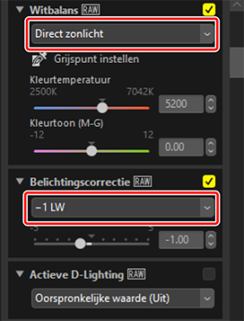 Pas instellingen aan in het aanpassingenpalet. Hier hebben we [Witbalans] ingesteld op [Direct zonlicht] en [Belichtingscorrectie] op [−1 LW].
