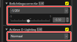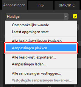 Wanneer aanpassingen worden gekopieerd van RAW-beelden of samengevoegde pixel shift beelden naar JPEG-, HEIF- of TIFF-beelden, worden [Belichtingscorrectie.], [Picture Control] en andere instellingen die alleen beschikbaar zijn voor RAW-beelden en samengevoegde pixel shift beelden niet toegepast.