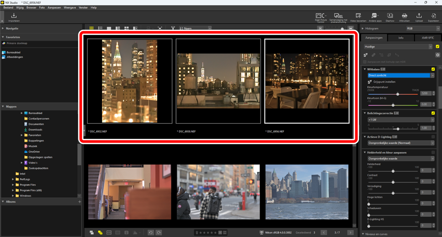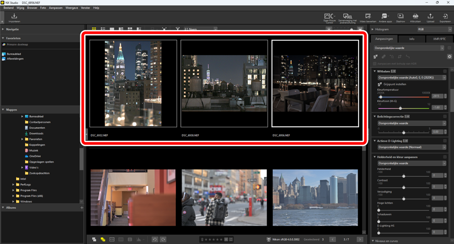 Selecteer foto's. In dit voorbeeld is de geselecteerde foto al aangepast met behulp van de tools [Belichtingscorrectie] en [Actieve D-Lighting].