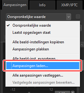 - Laad opgeslagen aanpassingen vanaf een aanpassingsbestand en pas ze toe op de foto's in de huidige selectie.