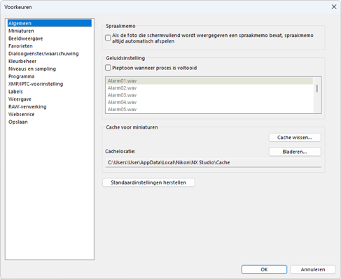 - Als [Pieptoon wanneer proces is voltooid] is geselecteerd, maakt NX Studio een geluid wanneer de verwerking is voltooid. Het geluid kan worden geselecteerd uit de lijst.