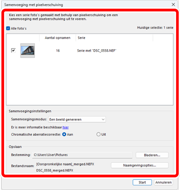 Pas in het dialoogvenster [Samenvoeging met pixelverschuiving] instellingen aan zoals “Samenvoegingsmodus” (aantal gegenereerde beelden) en “Chromatische aberratiecorrectie”.