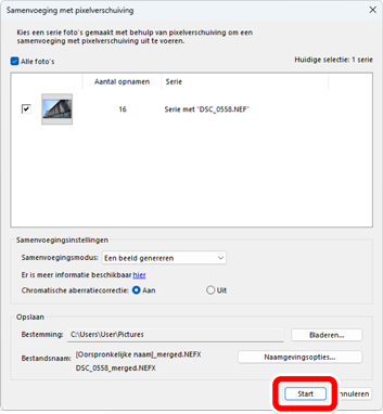 Klik op [Start] om het gecombineerde beeld (samengevoegde pixel shift beeld) op te slaan in de doelmap.