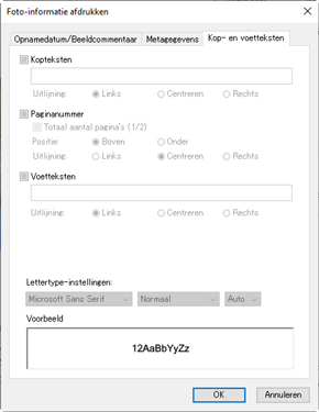 - [Voetteksten]: Voer de tekst in en kies de uitlijning voor de voetteksten die onderaan elke pagina zal worden afgedrukt.
