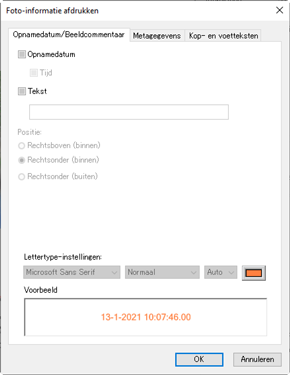 - [Lettertype-instellingen]: kies het lettertype, de stijl, lettertekengrootte en kleur gebruikt om de datum/tijdstempel af te drukken.