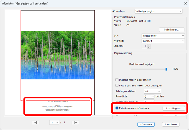 Om de informatie die onder elke foto wordt afgedrukt te kiezen, selecteert u [Foto-informatie afdrukken] in het dialoogvenster “Afdrukken” en klikt u op [Instellingen].