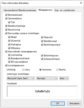 - [Lettertype-instellingen]: kies het lettertype, de stijl en de puntgrootte die worden gebruikt om metagegevens af te drukken.