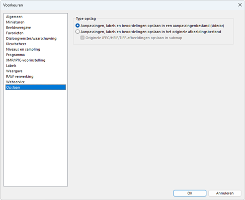 Om beeldaanpassingen op “sidecar”-bestanden op te slaan, kiest u [Aanpassingen, labels en beoordelingen opslaan in een aanpassingenbestand (sidecar)] voor [Type opslag]. Wijzigingen in foto's worden opgeslagen in beeldaanpassingsbestanden (sidecar) (extensie “.nksc”), afzonderlijk van de gegevens van het oorspronkelijke bronbestand. Omdat wijzigingen niet rechtstreeks worden toegepast op de originele beeldgegevens, kunnen foto's herhaaldelijk zonder kwaliteitsverlies worden bewerkt. Sidecar-bestanden worden ook gebruikt voor het opslaan van labels, scores, XMP/IPTC-metagegevens en andere gegevens, naast beeldaanpassingen. Foto's kunnen altijd in hun oorspronkelijke staat worden hersteld door de sidecar-bestanden te verwijderen.