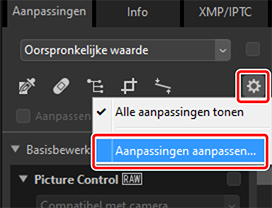 Selecteer de tools die worden weergegeven in het aanpassingenpalet. U kunt de volgorde van de tools wijzigen met de knoppen