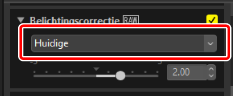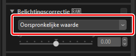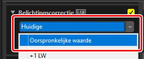 Elke tool beschikt over een keuzemenu dat verandert in [Huidige] wanneer bewerkingen worden uitgevoerd. Selecteer [Oorspronkelijke waarde] om terug te keren naar de instellingen die van toepassing waren toen de foto werd gemaakt.