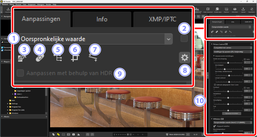 Aanpassingen worden aangebracht in het HDR-toonbereik (0 HDR-foto's). We raden u aan om een HDR-compatibele monitor te gebruiken om te bepalen of aanpassingen de gewenste resultaten opleveren. Andere monitors kunnen mogelijk niet nauwkeurig hoge lichten en verzadigde kleuren reproduceren.