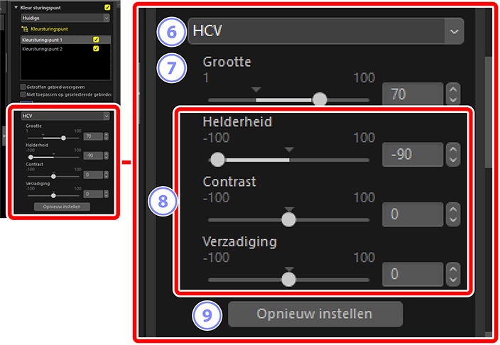 Wanneer u een kleursturingspunt plaatst, detecteert (), NX Studio automatisch de kleur bij het gekozen punt en selecteert alle vergelijkbare kleuren in het omliggende gebied. Het effect wordt geregeld door middel van schuifbalken: een ééngrootteschuifbalk (